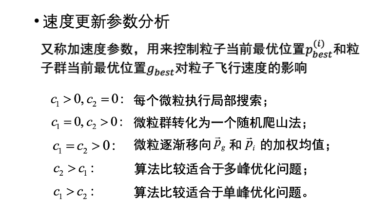 速度更新公式包含三项,第一项为惯性项(保持原速度不变的倾向),第二项为记忆项(回到历史最好位置的倾向),第三项为社会项(走向粒子群全局最好位置的倾向)。