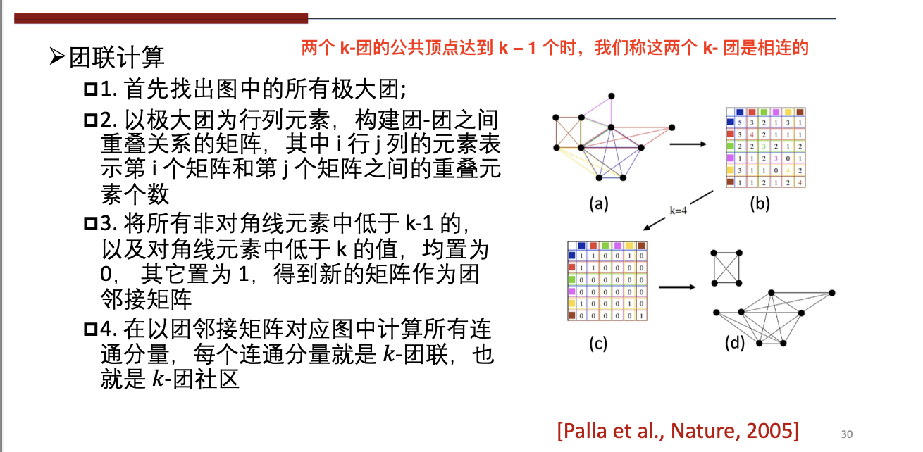 k-clique算法,允许社区重叠,将发现的社区定义为团联。给定一个大于1的正整数k,由一系列k-团(节点数目为k的团)互相连接形成的子图称为k-团联。